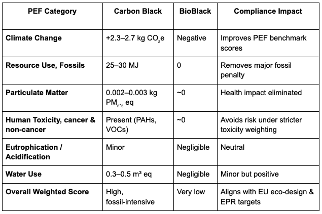 As you can see, BioBlack offers measurable benefits. Unlike petroleum-derived carbon black, which is energy-intensive, fossil-fuel based, and associated with toxic contaminants, BioBlack is 100% bio-based and carbon negative. Its use reduces greenhouse gas emissions, eliminates fossil fuel dependence, and avoids harmful substances like nanomaterials—all key factors in improving eco-score ratings.